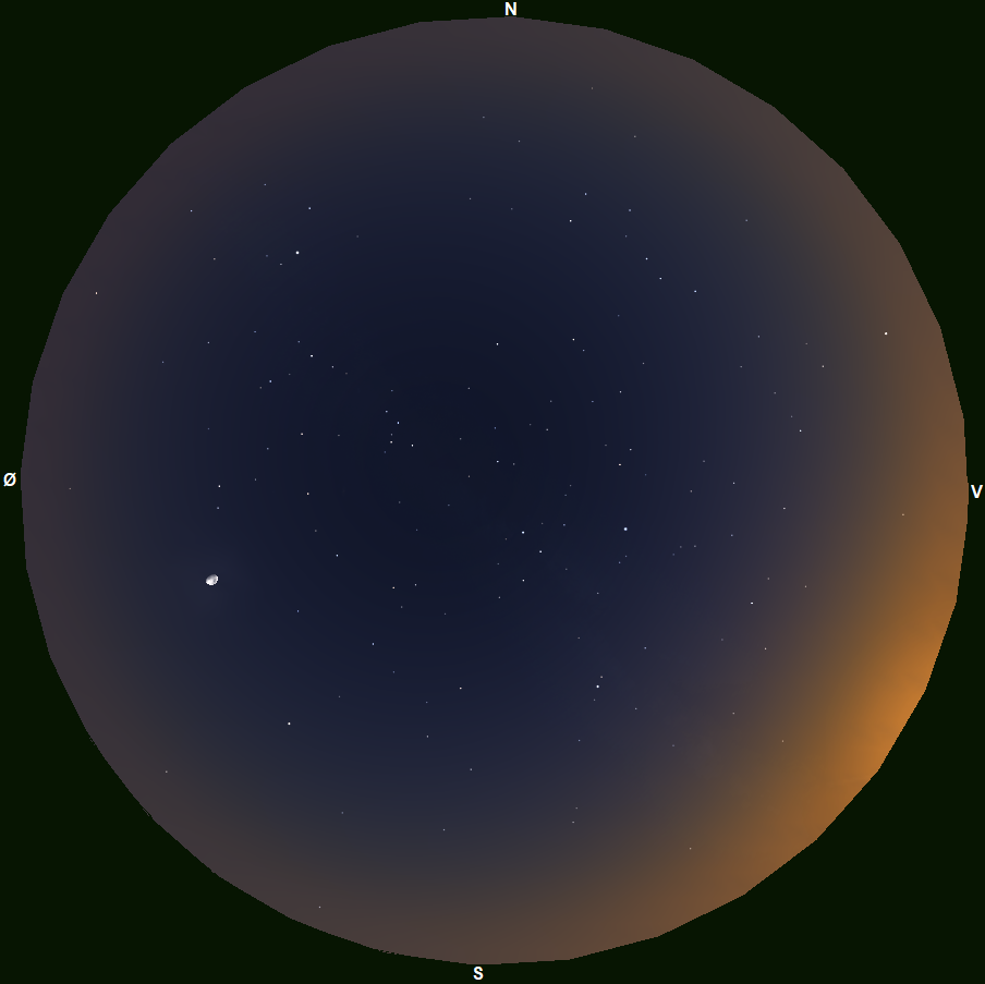 Stjernehimlen en time efter solnedgang den 1. december 2025. Den tiltagende måne står mod østsydøst og ’stjernen’ som står i omtrent samme højde mod sydøst er planeten Saturn.