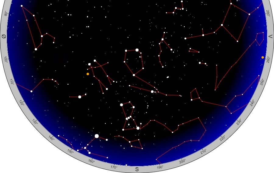 Mod sydsydøst ses himlens klareste stjerne Sirius, som sammen med Betelgeuze i Orion og Procyon i Lille Hund danner Vintertrekanten. Højere på himlen mod sydøst står de to Tvillinger Castor og Pollux, som i øjeblikket har følgeskab af planeten Jupiter, og direkte mod øst er Løven stået op, og de skarpsynede kan under en mørk himmel skelne Ekliptikas svageste stjernebillede Krebsen mellem Tvillingerne og Løven. I den modsatte retning er Pegasusfirkanten på vej ned under horisonten mod vest, og det samme er planeten Saturn i Fiskene. Lodret over hovedet ses Capella i Kusken og Perseus, Andromeda, Trekanten og Vædderen står fortsat højt på himlen, medens Fiskene og Hvalfisken efterhånden forsvinder ud af syne.