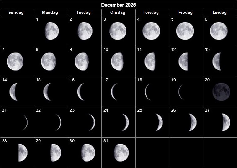 Dagene er korte i december. Den 1. viser Solen sig først kl. 08:22, og den går ned igen kl. 15:53. Det giver en dagslængde på 7 timer og 31 minutter, og den 31. er de tilsvarende tider henholdsvis kl. 08:46 og kl. 15:57, hvilket vil sige 7 timer og 11 minutters dagslys, så selv når tusmørket trækkes fra, bliver det til mange mørke timer. Ind imellem har vi passeret årets korteste dag, som i 2025 falder den 21. december. Helt præcis når Solen sin sydligste position på Ekliptika kl. 16:03. På dette tidspunkt er det kvarters tid siden, den gik ned her i Danmark, idet solnedgang denne dag er kl. 15:49. Når Solen kulminerer, dvs. står højest på himlen mod syd kl. 12:16, befinder den sig kun godt 11° over horisonten. Skyggerne er derfor ekstra lange selv ved middagstid. I modsætning hertil kulminerer Solen i en højde af 58° ved midsommer. Bemærk at de nævnte tidspunkter for solop- og nedgang gælder for Odense. Andre steder i Danmark vil der forekomme en mindre afvigelse pga. en anden geografisk placering.