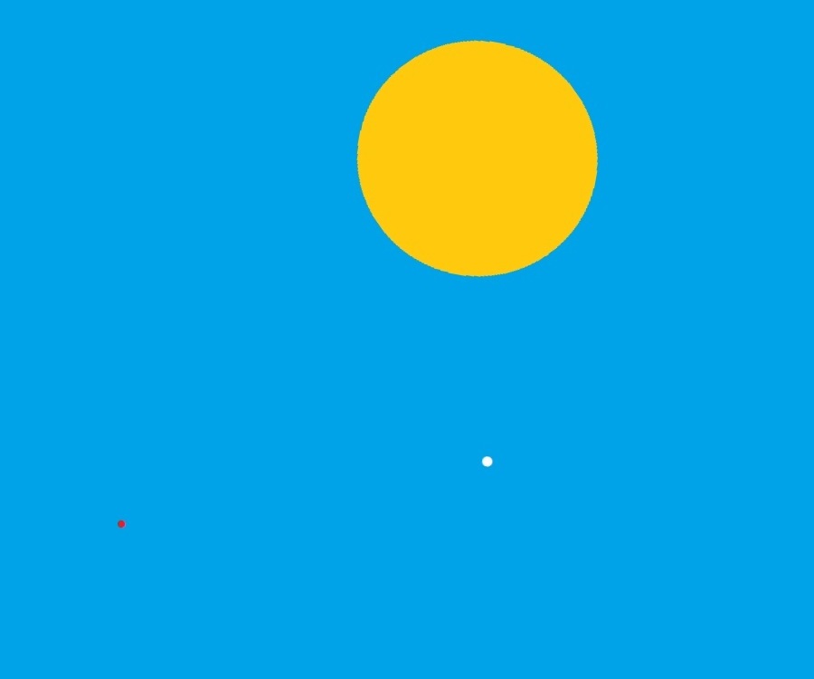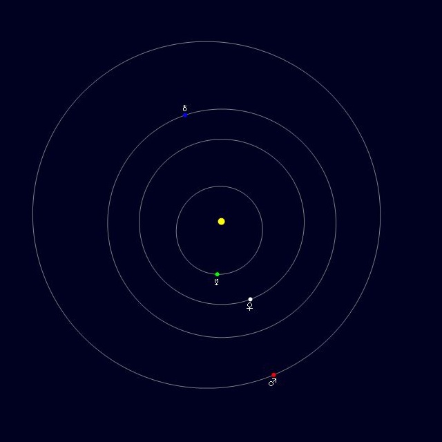 Det indre Solsystem den 9. januar 2026. Mars og Jorden står præcist på hver sin side af Solen, og som det fremgår, befinder Venus og Merkur sig også på den modsatte side af Solen i forhold til Jorden.