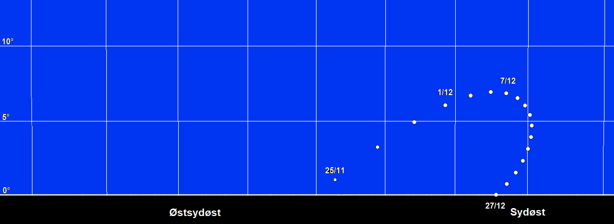 En af de sidste gode muligheder med Merkur forholdsvist højt over horisonten på en nogenlunde mørk himmel er den 17. december, hvor planeten og den aftagende måne står i en højde på 5° tre kvarter før solopgang. Bemærk jordskinnet på Månen. Hvorvidt der er muligt at finde Merkur i juledagene kommer til at afhænge af, hvor klar himlen er om morgenen. Merkur bliver ganske vist endnu klarere men står også lavere og lavere.