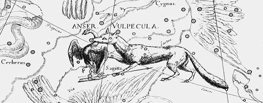 Ræven bærer en gås i retning af den mangehovede hund Cerberus på denne illustration fra Hevelius’ Firmamentum Sobiescianum. Selv om Hevelius kaldte de to figurer ’Vulpecula cum Ansere’’ i sit stjernekatalog, tegnede han to stjernebilleder med navnene ’Anser’ og ’Vulpecula’ på stjernekortet.
