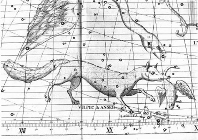 Ræven og gåsen vist som “Vulpec & Anser” på John Flamsteeds Atlas Coelestis fra 1729.