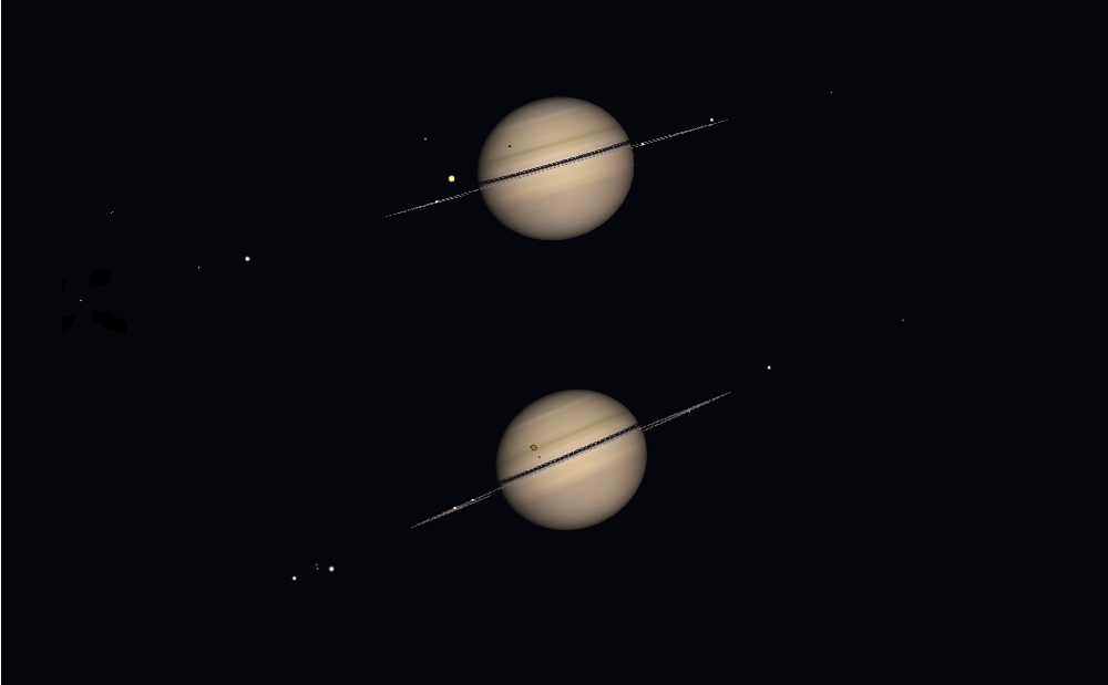 Ringenes minimale hældningsgrad har imidlertid den fordel, at det er nemmere at se de største af Saturns mange måner. Ud af dens i alt 274 måner kan en håndfuld under gode forhold ses gennem selv et beskedens astronomisk teleskop. Den største og klareste er Titan på mag. 8. Titan bruger 16 døgn til en tur om Saturn, så den tager to omgange hver måned. De store måners baneplan er sammenfaldende med ringplanet, hvilket betyder, at Titan med den nuværende hældningsgrad passere enten foran eller bag Saturn på samme måde, som det kendes fra Jupiters fire store måner. Der kræves dog et godt teleskop med en stor forstørrelse for at kunne se Titans skygge på Saturns skydække, for selv om Titan er lige så stor som Jupiters fire største, er afstanden fra Jorden til Saturn dobbelt så stor som til Jupiter. Fra danske breddegrader har alle disse passager desværre fundet sted i dagtimerne, men nu er det vores tur, for de to passager i december forekommer i aftentimerne. Den første er den 8. og den anden den 24.