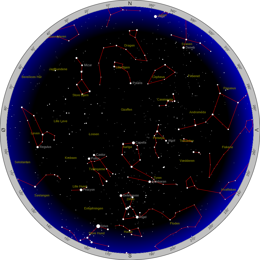 Stjernehimlen kl. 22 midt i januar. Planeterne er ikke med. Se om disse senere.