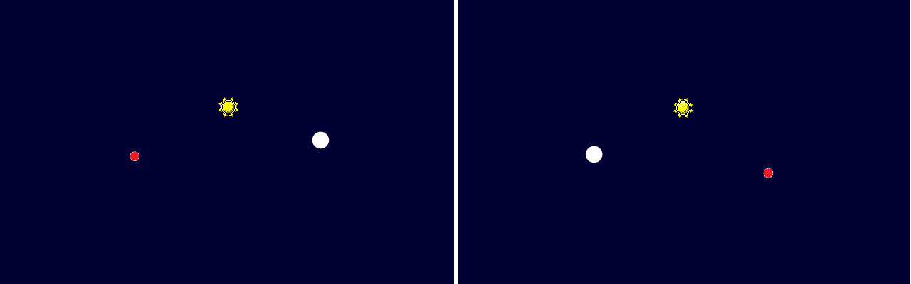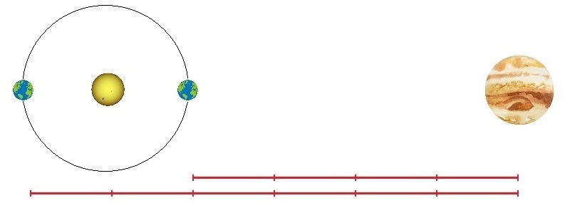 Jorden og Jupiter under opposition og konjunktion. Afstanden varierer omkring 300 millioner kilometer, hvilket svarer til jordbanens diameter om Solen. Bemærk at Solens og planeternes indbyrdes størrelsesforhold ikke er korrekt.