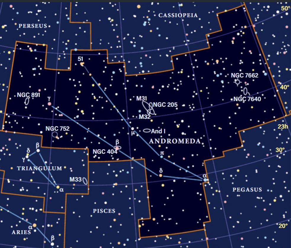 I samme område befinder sig endnu et objekt, der ses som en tåget plet på mag. 3½ med det blotte øje. Denne gang er der ikke tale om en åben stjernehob med et par tusinde stjerner, men om en galakse med én billion stjerner, nemlig Mælkevejens nabo Andromedagalaksen M31. Med en afstand på 2½ million lysår er M31 det fjerneste objekt, som kan ses med det blotte øje. Det man ser som en tåget plet på størrelse med Månen er galaksens lysstærke center. Hele udstrækningen er omkring 4°