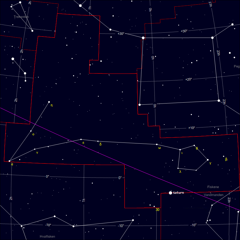 Ligesom det er tilfældet for Andromeda og alle de øvrige stjernebilleder, følger afgrænsningen af Fiskene deklinations- og rektascensionslinjerne. Saturn bevæger sig således ind i et hjørne af Fiskene.