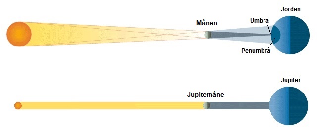 Solformørkelse på henholdsvis Jorden og Jupiter. Tegningen er skematisk, og størrelsesforholdet passer naturligvis ikke.