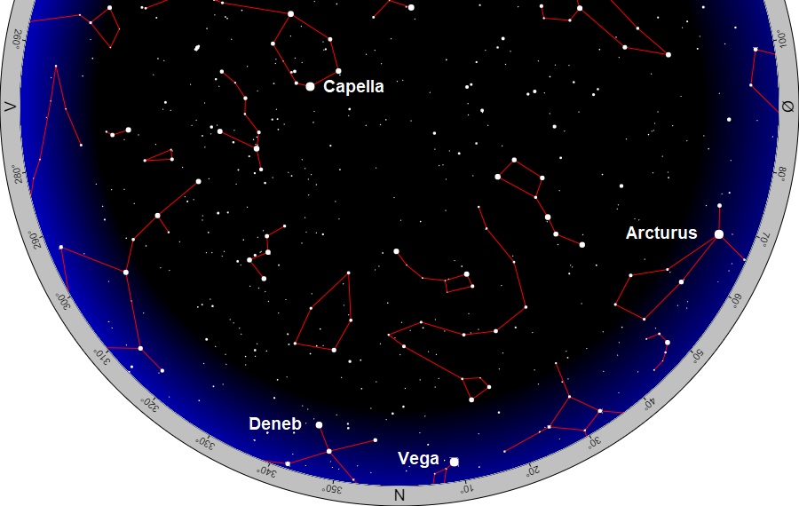 Et blik på himlen mod nord omkring midnat bekræfter, at vi befinder os midt i vinteren og så langt fra sommeren som næsten muligt. Lavt over horisonten kan man se de to cirkumpolare stjerner Deneb og Vega. Vega er den klareste, medens den noget svagere Deneb kan være lidt vanskeligere at se, fordi lyset bliver svækket, når det bevæger sig gennem Jordens atmosfære tæt på horisonten. De fleste kender Deneb og Vega som to af Sommertrekantens stjerner højt på himlen om sommeren. Sommertrekantens tredje stjerne, Altair, er ikke cirkumpolar og befinder sig langt under horisonten på denne tid af året og natten.