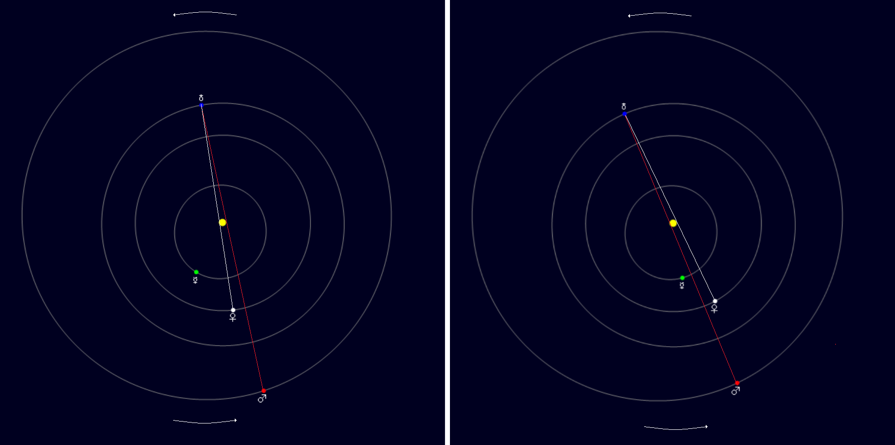 Hvis vi ser Solsystemet fra oven (fra Solens nordpol) bevæger alle planeterne sig modsat uret, så den modsatrettede bevægelse er kun tilsyneladende, for vi ser jo Solsystemet fra Jordens perspektiv, og eftersom Jorden bevæger sig langsommere end Venus men hurtigere end Mars, vil synsretningen hele tiden ændres, fordi Venus ”overhaler” Jorden og Jorden ”overhaler” Mars.
