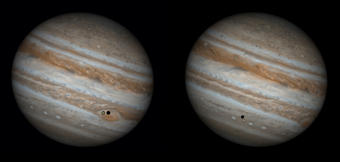 En jupitermåne og dens skygge umiddelbart før og efter oppositionen. Første tilfælde er det Io, og i det andet er det Europa.
