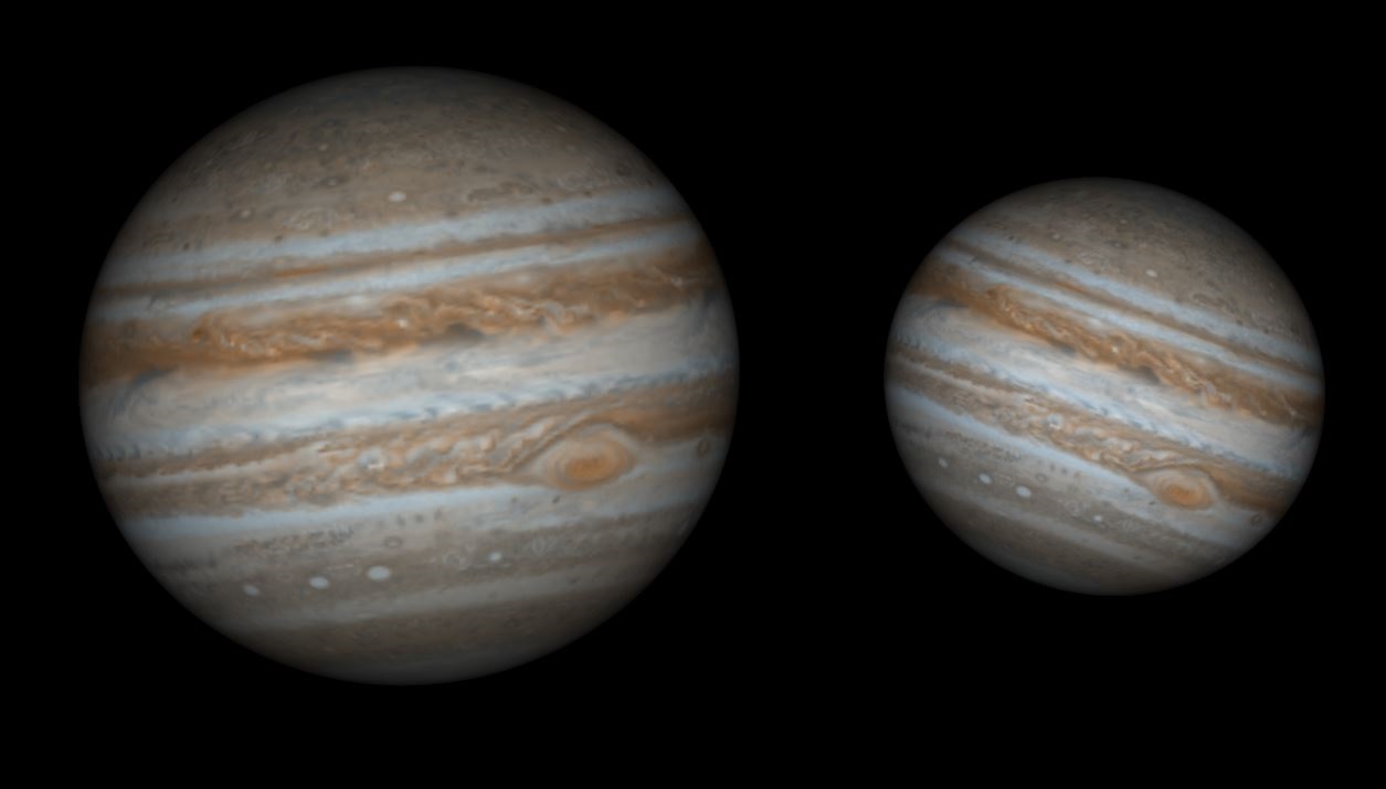 I modsætning hertil vil afstanden til Jupiter under den kommende konjunktion den 29. juli være 943 millioner kilometer, og dens udstrækning 31½”. På dette tidspunkt kan Jupiter imidlertid ikke ses, fordi den jo befinder sig i samme retning som Solen.