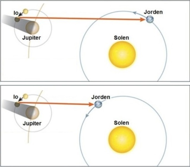 Når Io bevægede sig ind i Jupiters skygge, noterede Ole Rømer tidspunktet. Under en senere observation var Jorden og Jupiter tættere på hinanden, og formørkelsen synes derfor at ske tidligere end forventet, fordi lyset ikke skal bruge så lang tid på at nå Jorden.