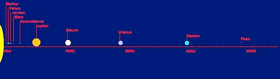 Afstanden mellem planeterne i astronomisk enheder. Planeternes størrelse er ikke i samme målestok.