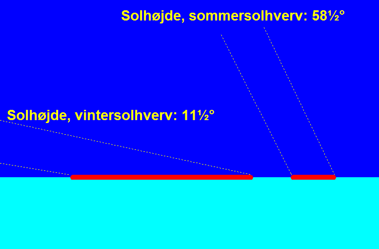 Solhøjden. Fyn har en geografisk bredde på ca. 55°, og det betyder, at Solen maksimalt står ca. 58½⁰ over horisonten ved middagstid om sommeren, medens den om vinteren kun når 11½⁰. Den samme mængde solenergi skal derfor fordeles på et større areal om vinteren, og energien bliver yderligere reduceret, fordi dagene er kortere.