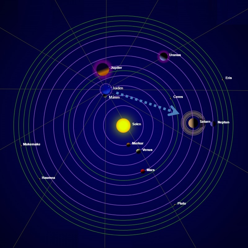 Solsystemet set fra ’oven’ den 15. januar. Bemærk at afstandene mellem planeterne ikke er korrekte.