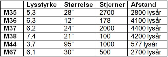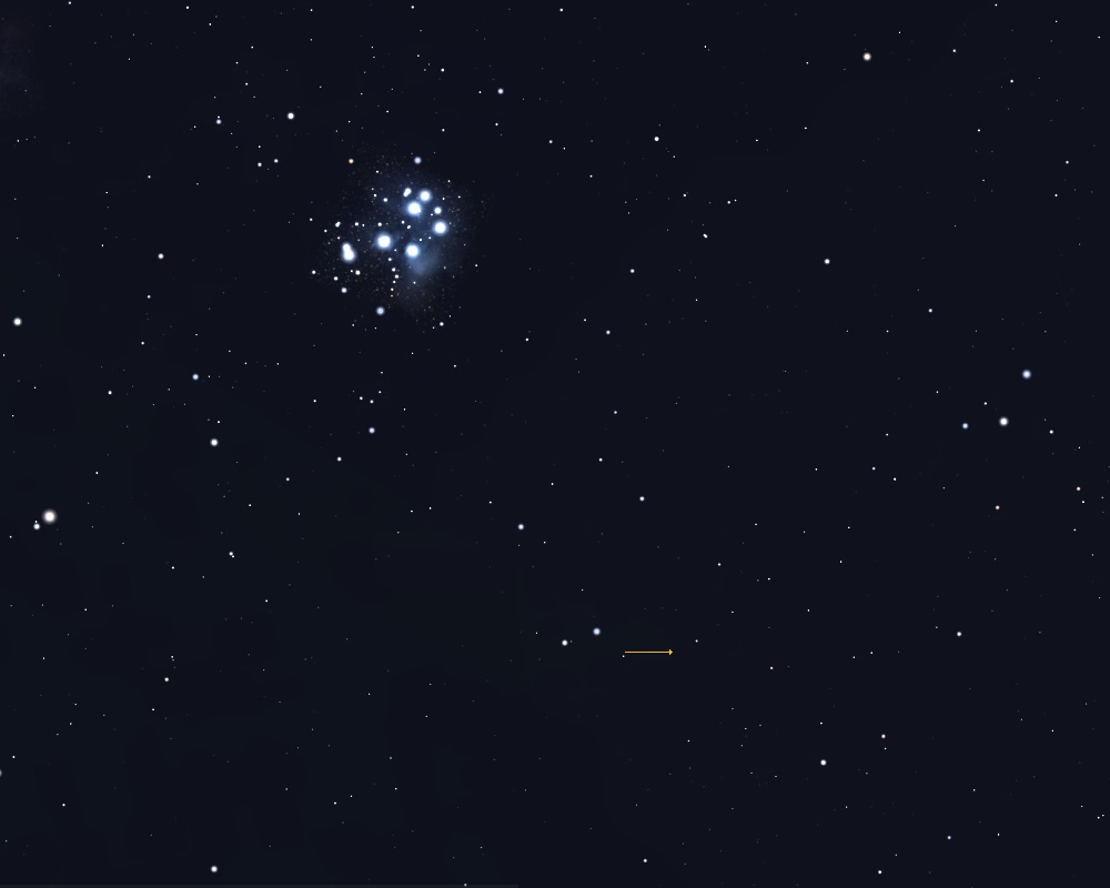 M45 – bedre kendt som Plejaderne eller Syvstjernen – ligger udenfor det viste kort. M45 befinder sig i Tyren og er den klareste åbne stjernehob på himlen og er samtidig en af de nærmeste, idet dens afstand er 440 lysår. Med det blotte kan man normalt se seks stjerner og under gunstige omstændigheder op til omkring 10. Med en prismekikkert forøges antallet til over hundrede, og gennem et teleskop bliver det til næsten 1000. Plejaderne er en ung hob. Den blev dannet for ca. 100 mio. år siden og befinder sig 440 lysår fra Jorden. Den klareste stjerne midt i hoben er Alcyone på mag 2,9. Plejaderne har en udstrækning på 2°, dvs. 4 gange Månens diameter. Hvis hele hoben skal være indenfor synsfeltet i et teleskop, skal der således bruges et widevinkelokular med lav forstørrelse. Se mere om Plejaderne i oktober 2025.