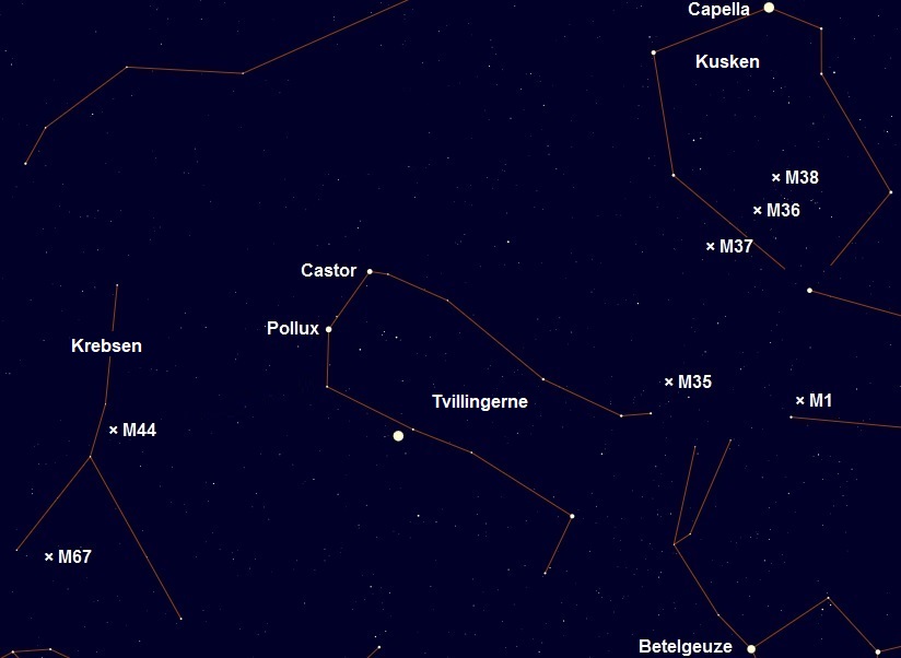 Tvillingerne, Krebsen og Kusken. Betelgeuze i den øverste af Orion kan netop ses nederst til højre. Den klare ”stjerne” næsten midt i billedet er planeten Jupiter.