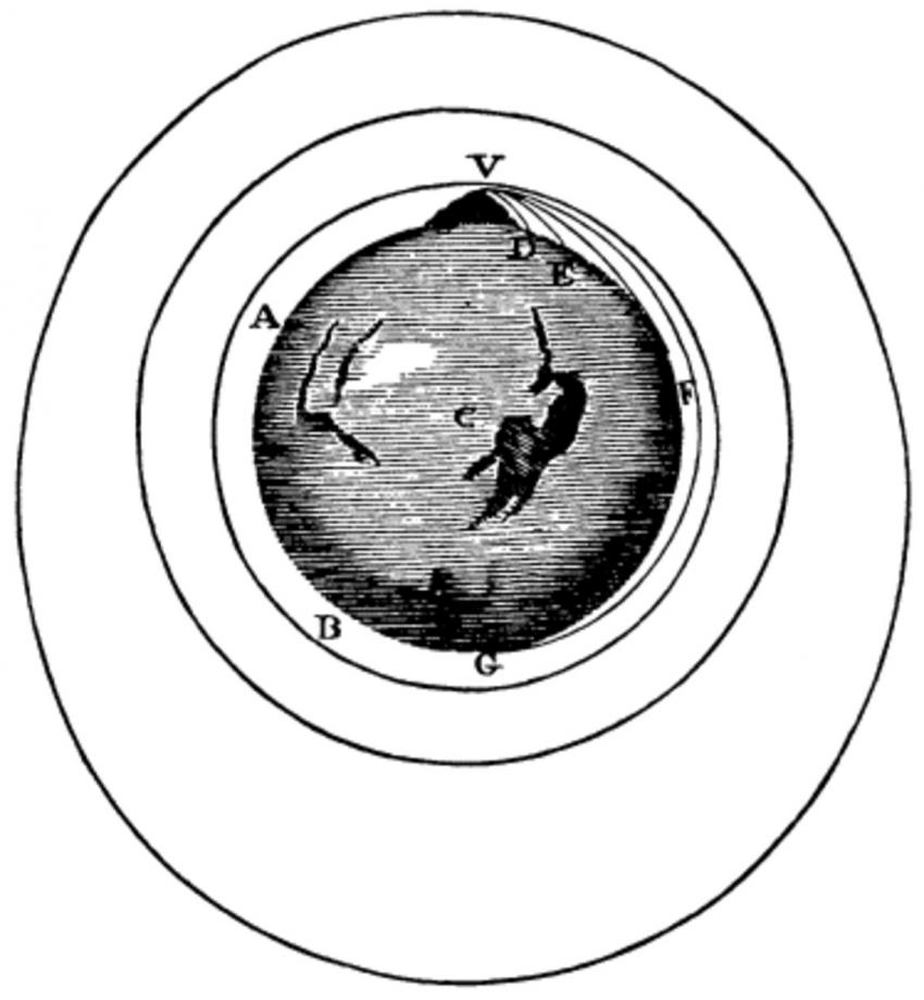 Newtons skitse i Principia af kanonkuglen.