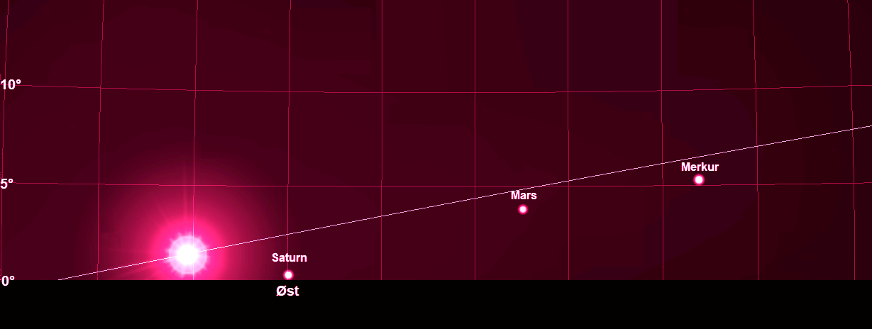 Planeternes position den 31. marts nogle minutter efter solopgang. Afstanden mellem de lodrette linjer er 5°, og den skrå linje er Ekliptika.
