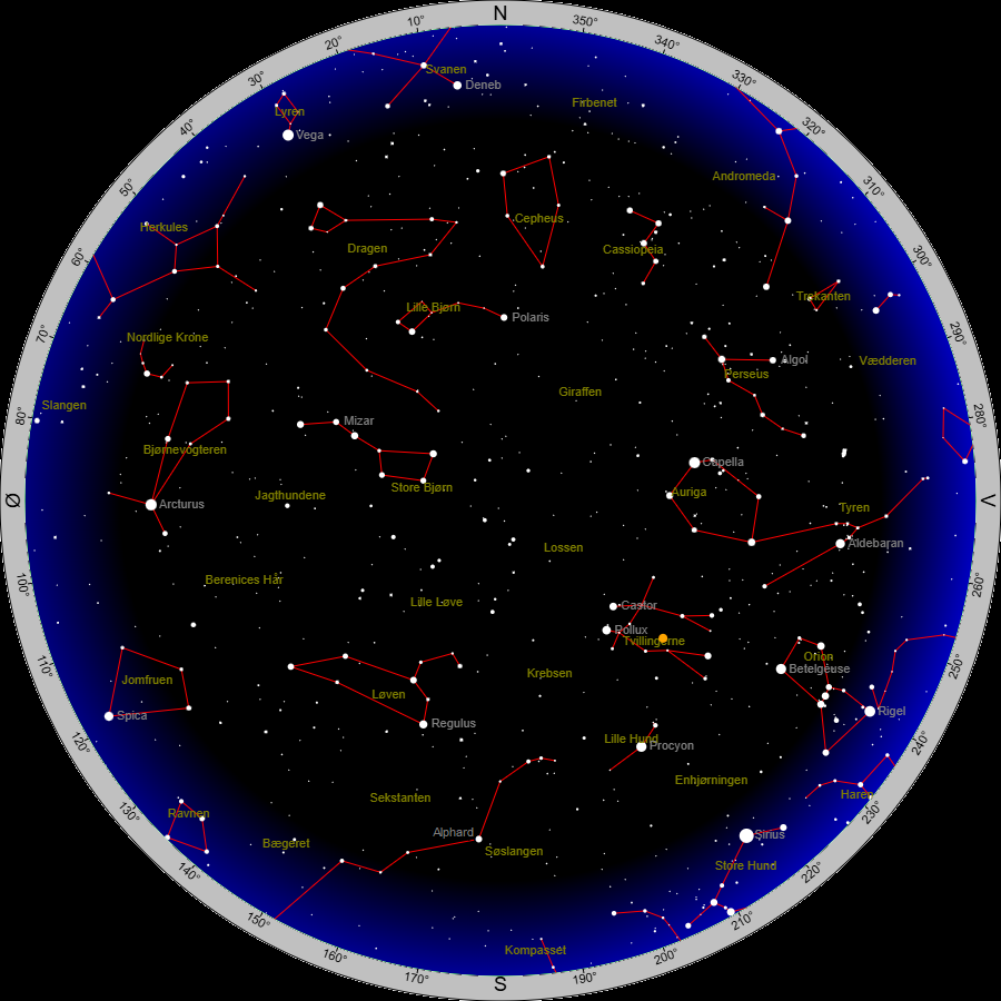 Stjernekort med stjerne- og konstellationsnavne på samme tidspunkt som ovenstående. Den orange ”stjerne” i Tvillingerne er planeten Jupiter.