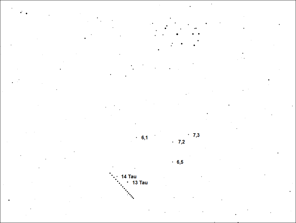Uranus bane i marts. 13 og 14 Tau er markeret, og de fire øvrige angivelser er de pågældende stjerners lysstyrke.