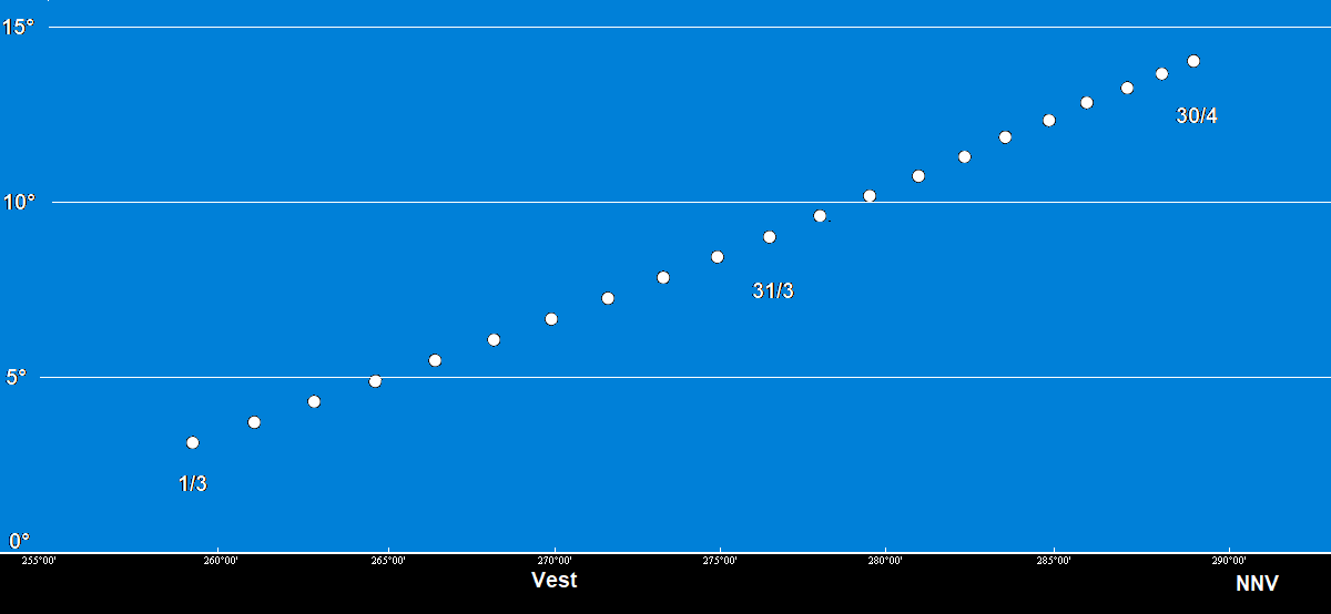 Venus højde og position 1. marts – 30. april tre kvarter efter solnedgang.