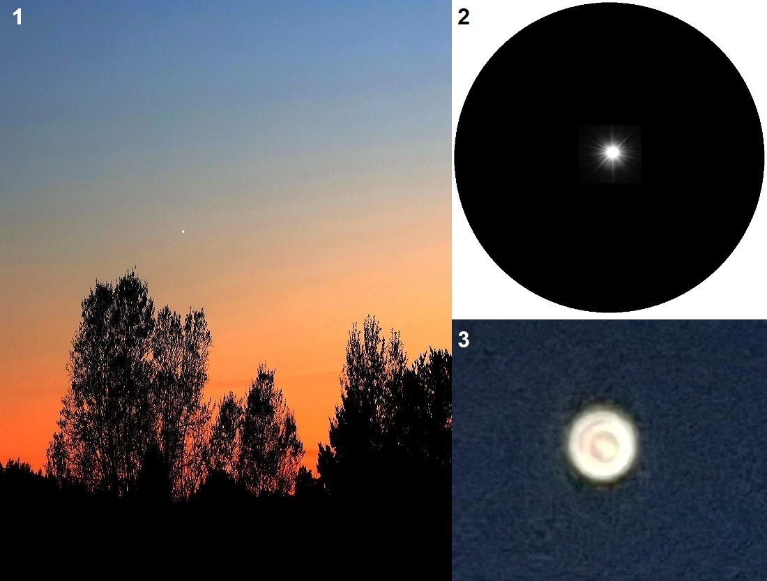Venus med det blotte øje (1), gennem en prismekikkert (2) og maximal zoom med en mobiltelefon (3).