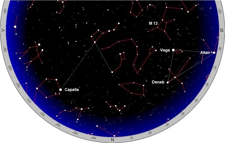 Cassiopeias W står lige mod nord, medens Karlsvognen står næsten lodret over hovedet, og ligesom man kan finde Nordstjernen ved hjælp af de to bagerste stjerner i ”vognkassen”, kan man ved at trække en tænkt linje gennem de to øverste finde en af nordhimlens klareste stjerner, Capella i Kusken. Capella står lavt mod nordvest, og set fra Danmark forsvinder den aldrig under horisonten, idet den på samme måde som Vega og Deneb er cirkumpolar.