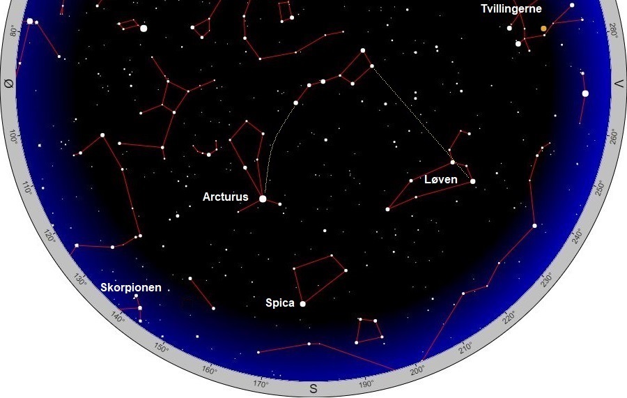 Himlen mod syd ved astronomisk midnat midt i april. Retningen fra Karlsvognen til Arcturus og Regulus i Løven er angivet. Hvis den kurvede linje til Arcturus fortsættes, rammer den Spica i Jomfruen. Den orange ’stjerne’ i Tvillingerne er planeten Jupiter.