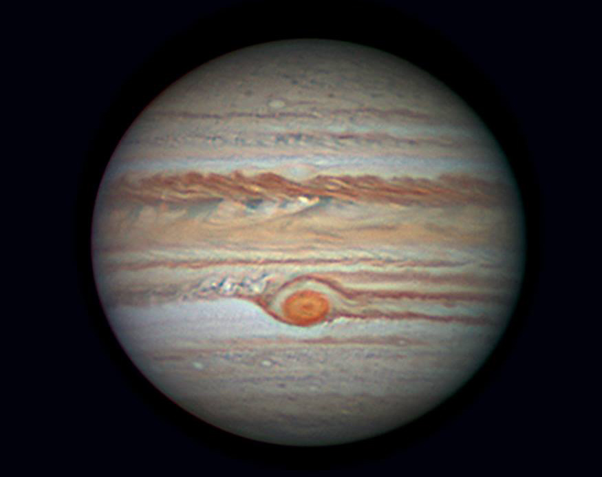 Jupiters store røde plet er også forholdsvis nem at se, selv om den i de senere år er blevet mindre og har skiftet form fra oval til mere cirkulær. Den røde plet er en enorm anticyklon, som har været kendt i omkring 350 år, hvilket gør den til Solsystemets ældste og største storm. Pletten er omkring 1½ større end Jorden, og den roterer mod uret med vindhastigheder på op til 680 km/t. Man kan naturligvis kun se den, når den er på den side af Jupiter, som vender ned mod Jorden, men eftersom Jupiter kun bruger knap 10 timer til en rotation om sin akse, varer det aldrig mere end højest 5 timer, før den dukker op.