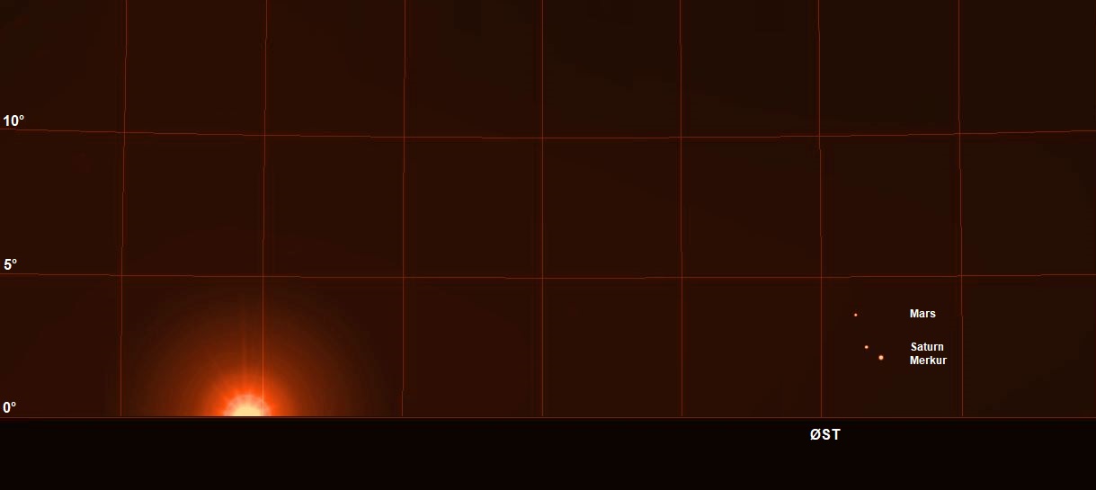 Mars, Saturn og Merkur befinder sig alle på morgenhimlen, hvor de står samlet i et område på 2° den 20. april. Selv om de står mere end 20° fra Solen, kan ingen af dem dog ses, for de står så lavt på himlen, at de forsvinder i morgengryet. Derudover befinder Neptun sig i samme område og kan således heller ikke ses i denne måned.