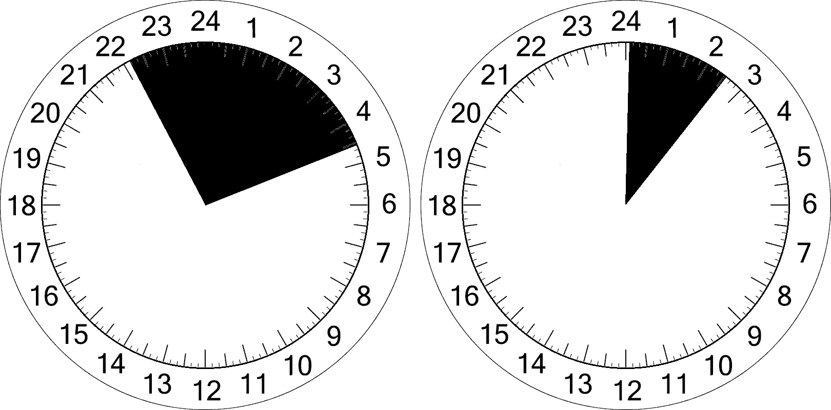 Urskiverne viser, hvor længe der pr. definition er nattemørke henholdsvis den 1. og 30. april.
