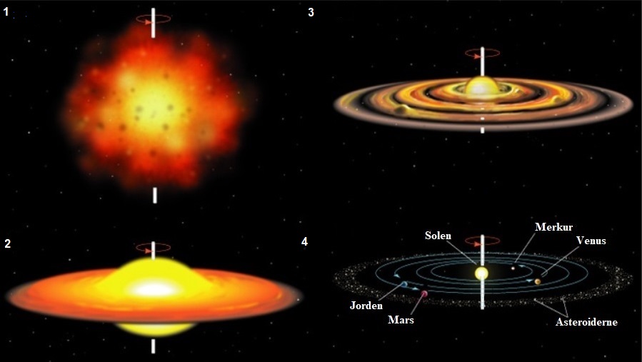 Dannelsen af Solsystemet. Kun de inderste klippeplaneter er med her, og for mange af asteroiderne gælder, at deres baner og rotation afviger fra de store planeter, fordi de er opstået ved sammenstød med andre større asteroider og derfor har fået mere kaotiske baneforhold.