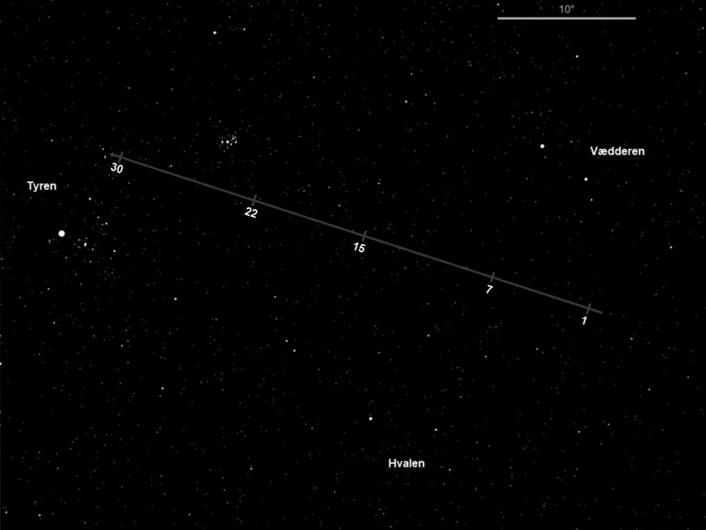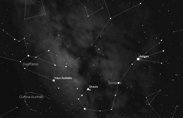 Skorpionen, Skytten og Mælkevejens centrum. I Danmark ligger Skorpionens krumme hale med giftbrodden under horisonten.