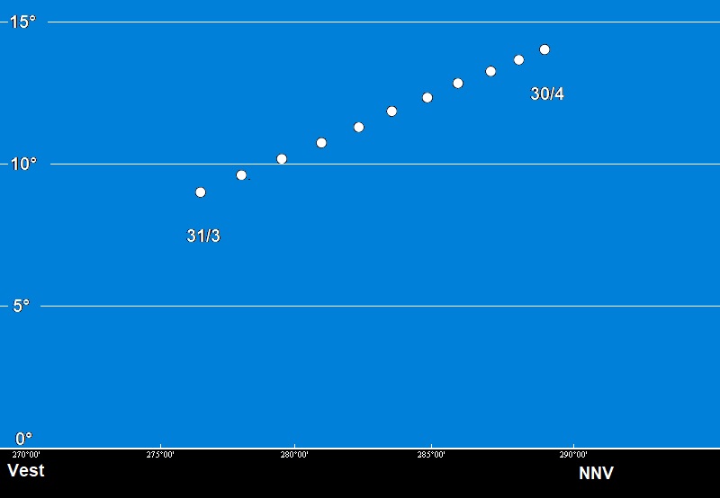 Den 1. april er det astronomiske tusmørke slut på Fyn umiddelbart efter kl. 22, og på månedens sidste nat er vi så tæt på de lyse nætter, at det astronomiske tusmørke først er slut få minutter efter midnat, og det varer kun knap 2½ time, før genskæret fra Solen igen så småt begynder at kunne ses langs horisonten mod nordøst. Herefter går det stærkt. En uge senere begynder de lyse nætter.